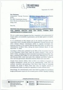 “Earlier today, we petitioned ICPC @icpcnigeria to investigate former Rivers State Sole Administrator, Vice Admiral Ibok-Ete Ekwe Ibas (retd.), over the N283.3 billion he received in six months with virtually nothing to show for it,” he said.