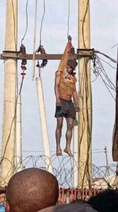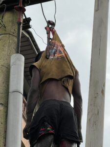 The man’s lifeless body was found dangling from the transformer at N0. 40 Omuma Road on Tuesday.